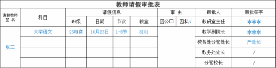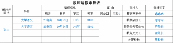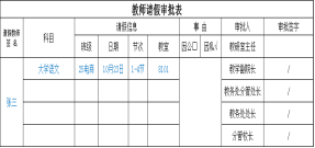 一周内1-4节课申请:直接在系统内提交申请,同时上传电子调课单信息截图、教研室主任同意请假的聊天记录截图(注:此情形下不再提供纸质版请假单)。