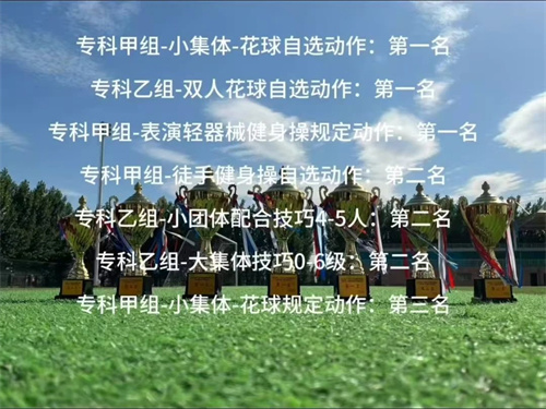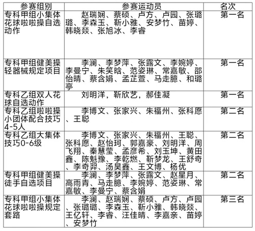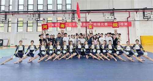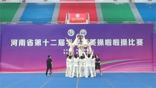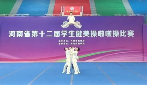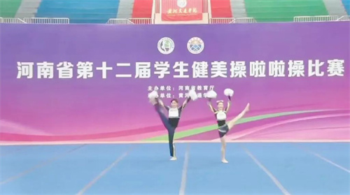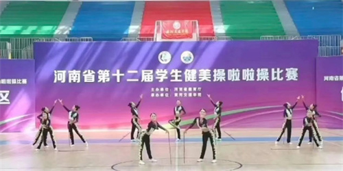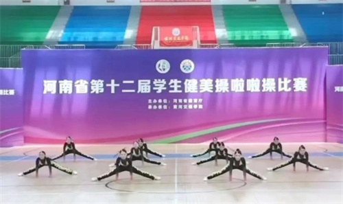 5月29日-6月4日,由河南省教育厅主办的河南省第十二届学生健美操啦啦操比赛在黄河交通学院体育馆举行。经过7天的紧张角逐,我校啦啦操代表队取得了三金、三银、一铜的优异成绩。本次比赛有来自全省18个地市,102所学校3200余名运动员参赛。我校选手心态沉稳、勇于应赛,经过精彩比拼,最终荣获专科甲组啦啦操小集体花球自选动作、专科甲组健身操轻器械规定动作、专科乙组双人花球自选动作金牌,专科乙组啦啦操小团体配合技巧4-5人、专科乙组大集体技巧0-6级、专科甲组健身操徒手自选动作银牌,专科甲组啦啦操小集体花球规定动作铜牌。