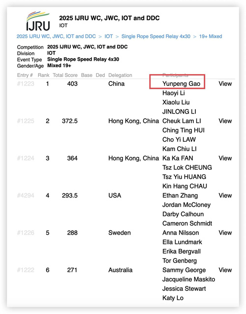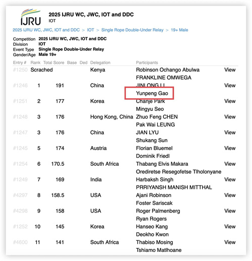 7月25日至8月4日,2025年世界跳绳锦标赛在日本川崎举行,我校体育与健康学院学生高云鹏斩获公开组19+男子双摇接力和混合组4×30秒单摇接力两项冠军,并在混合组两人同步花样项目中取得第五名。这也是我校诞生的首位世界冠军。